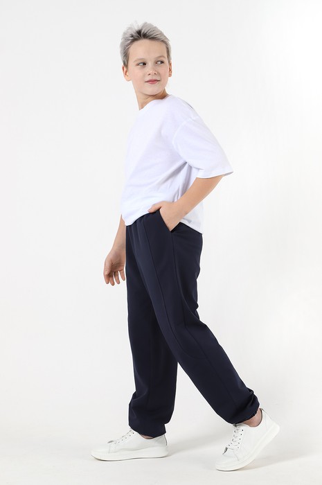 Брюки для мальчика изгладкокрашеного полотна "футер-двухнитка", на притачном поясе с эластичной тесьмой внутри и карманами в боковых швах. Средние половинки - из двух частей каждая, с отделочными строчками по швам стачивания. Нижние срезы обработаны подгибкой сэластичной тесьмой.