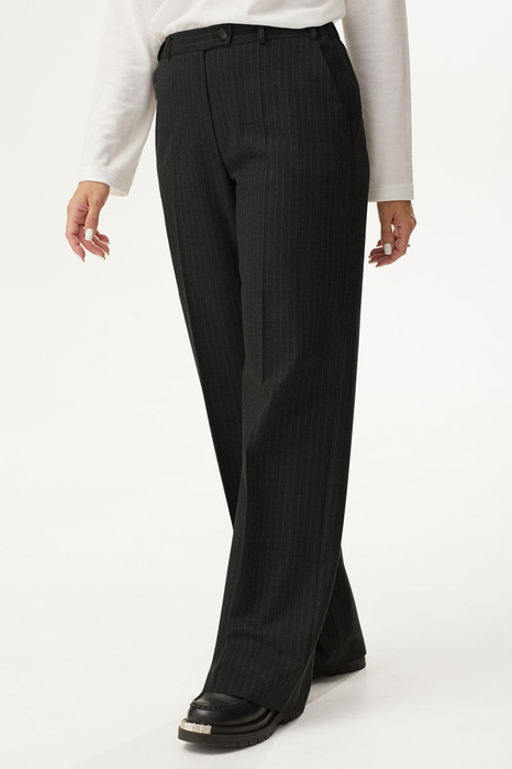 Брюки актуального кроя, прямого силуэта, выполнены из костюмной ткани с  вискозой. Верх оформлен притачным поясом с застежкой на петлю-пуговицу, резинкой по бокам и шлевками. Перед с карманами  и заутюженными «стрелками».