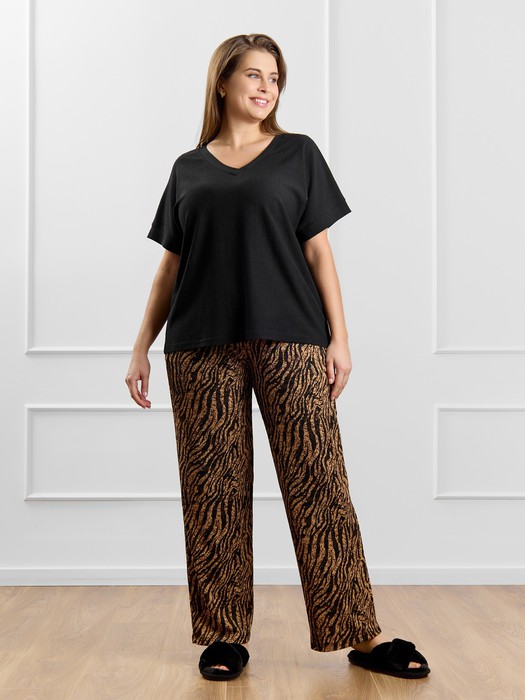 Брюки женские из трикотажного полотна «бурумчук» (шелковый креп) с набивным рисунком, прямого кроя, свободные, с карманами в боковых швах, на притачном поясе с эластичной тесьмой внутри.