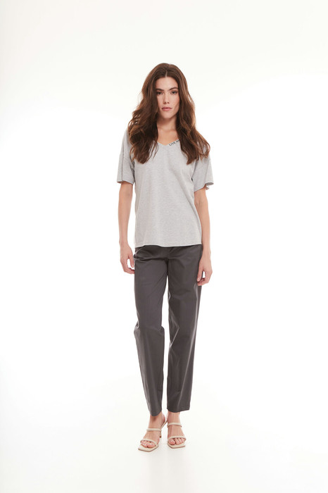 Брюки женские, зауженные к низу, длиной до щиколотки. По передним половинкам брюк фигурные боковые карманы и складка с отделочной строчкой. Задние половинки брюк с кокеткой и накладными карманами. Брюки с притачным поясам и шлевками, застежка на тесьму-«молния» и петлю с пуговицей. В нижней части брюк -вытачки.