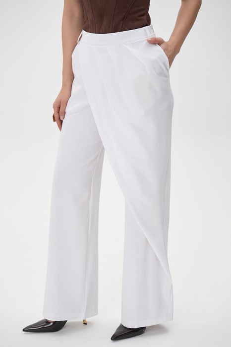 Оригинальные брюки с высокой посадкой расклешенного силуэта. Особенность этой модели – изысканный асимметричный запах спереди. Брюки из прочной ткани с добавлением вискозы застегиваются в левом боковом шве на потайную тесьму-молнию.