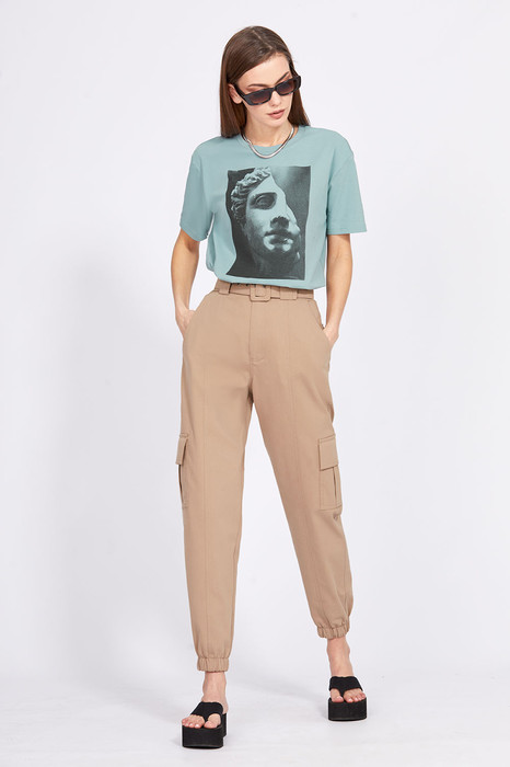 Брюки-карго выполнены из тонкого джинса. Брюки прямого покроя, на притачном поясе, в который частично вставлена эластичная тесьма по задней части. Спереди застежка на молнию с гульфиком и пуговицу. Карманы боковые с наклонным входом. Сзади накладные карманы, по боковым швам накладные карманы с клапанами. Низ брюк обработан манжетой с эластичной тесьмой. В комплект входит съемный ремень из основной ткани с обтяжной пряжкой.