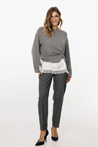 Брюки палаццо с притачным поясом из мягкой вельветовой ткани. Спереди застежка гульфик на молнии и петлей и пуговицей по поясу. По задней частям брюк вытачки. Пояс с резинкой в боковых частях. Брюки с заутюженными стрелками. Длина брюк с учетом пояса - 109 см.
