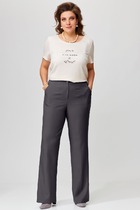 Брюки палаццо с притачным поясом из мягкой вельветовой ткани. Спереди застежка гульфик на молнии и петлей и пуговицей по поясу. По задней частям брюк вытачки. Пояс с резинкой в боковых частях. Брюки с заутюженными стрелками. Длина брюк с учетом пояса - 109 см.