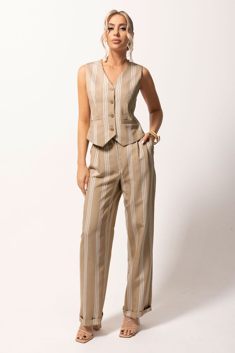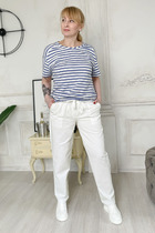 Брюки с отрезным поясом, на поясе расположены шлевки. В боковых швах расположены карманы. Вход в карман наклонный к боковому шву. Застежка гульфик. Пояс в области спинки присборен на резинку.
