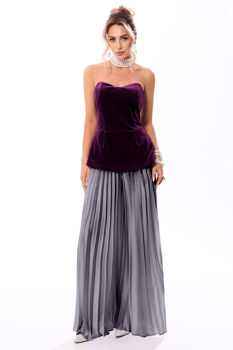 Брюки- гофре расширенного силуэта, с отрезным поясом, без застежки, верх брюк присборен на резинку. Брюки без боковых швов.