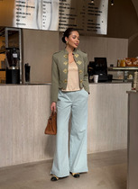 Брюки прямого силуэта, выполнены из шифоновой ткани на подкладке полной длинны. Боковой шов брюк открыт. Синка брюк заходит на перед  по верхней части. Подкладка из не просвещающейся креповой ткани. Верх брюк обработан отрезным поясом. Центральная часть пояса без резинки, остальной пояс на резинке. Низ брюк обработан швом « в подгибку».