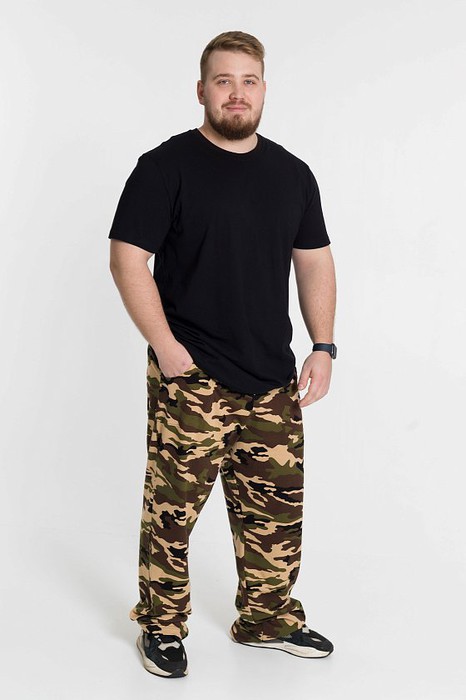 Брюки мужские из хлопкового полотна (камуфляж). Прямого кроя, с карманами по бокам. Пояс брюк на резине.