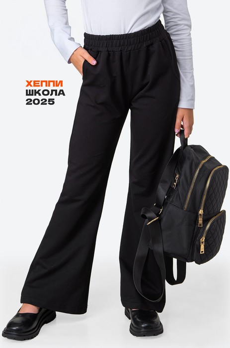 В школу – элегантной походкой! Стильные трикотажные брюки клеш для девочки и девочки-подростка выполнены из ткани футер черного цвета. Детские расклешенные брюки с высокой посадкой, пояс на эластичной резинке, по бокам предусмотрены удобные карманы.