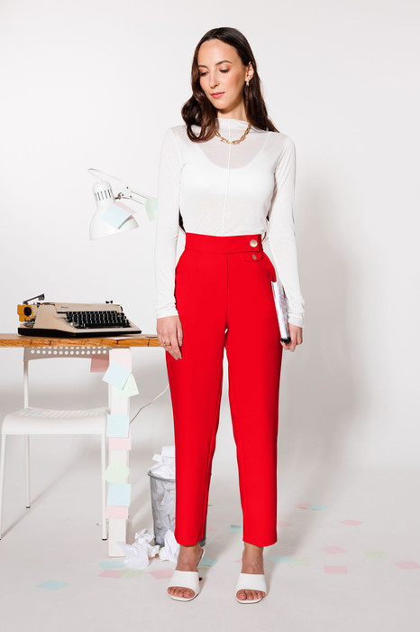 Лаконичные прямые брюки — основа базового гардероба. Выполнены из плотной костюмной ткани на основе вискозы, дышащей и приятной к телу. Отрезной пояс обеспечивает комфортную посадку по фигуре. По переду и сзади - декоративные клапаны декорированные пуговицами. Длина брюки - 98 см.