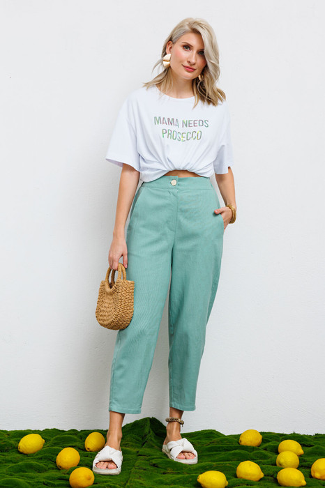 Брюки длиной «по косточку» легко впишутся в гардероб и останутся в нем на много сезонов. Пояс с резинкой для идеальной посадки по талии. Сзади расположены накладные карманы с клапаном.  Длина - 95 см.