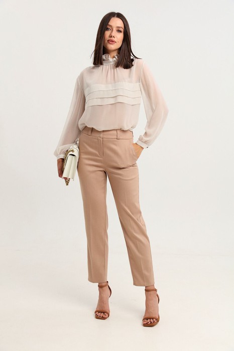 Брюки классического силуэта с комфортной средней посадкой на притачном поясе со шлёвками. По переду брюк застежка-молния. Спереди косые боковые карманы, сзади имитация прорезных карманов с листочкой. Лаконичность форм подчеркивается строгой посадкой по линии талии, а минимализм в деталях – прорезными карманами и заутюженным кантом. Рост фотомодели 175 см. Размер у фотомодели – 44.