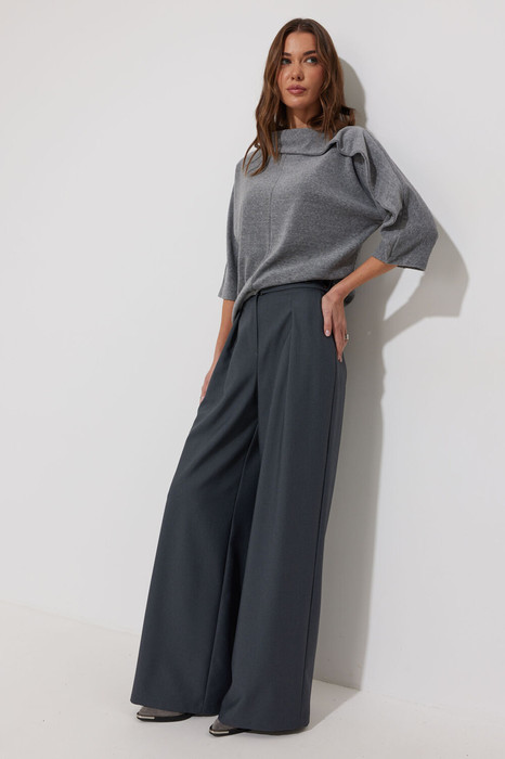 Брюки из поливискозной ткани, прямого, расширенного силуэта. На передних половинах брюк по одной складке, выходящих из-под пояса. По переду застежка на молнию по типу гульфик. Брюки по переду с карманами в отрезных бочках. Пояс по переду с застежкой на хлястик, продевается через металлическую рамку и застегивается на две металлические пуговицы на ножке. Обращаем Ваше внимание, что фурнитура может незначительно отличаться от фото. По спинке в пояс вставлена резинка. На задних половинах брюк вытачки.