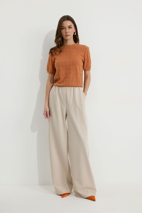 Брюки из поливискозной ткани, прямого, расширенного силуэта. На передних половинах брюк по две складки, выходящих из-под пояса, складки застрочены на несколько сантиметров. По переду застежка на молнию по типу гульфик. Брюки по переду с карманами в отрезных бочках. Пояс по переду с застежкой на петлю и пуговицу. Со шлевками по переду и спинке. По спинке в пояс вставлена резинка. На задних половинах брюк вытачки. Обращаем Ваше внимание, что фурнитура может незначительно отличаться от фото.