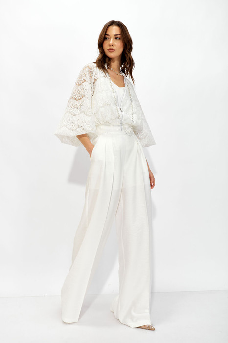 Брюки прямого силуэта из струящейся ткани.  По верху брюк притачная декоративная резинка.  По переду обработаны карманы в боковых швах и декоративные складки. На задних половинках брюк  листочки. Брюки на подкладке! Обращаем ваше внимание, что фурнитура может отличаться от фото.