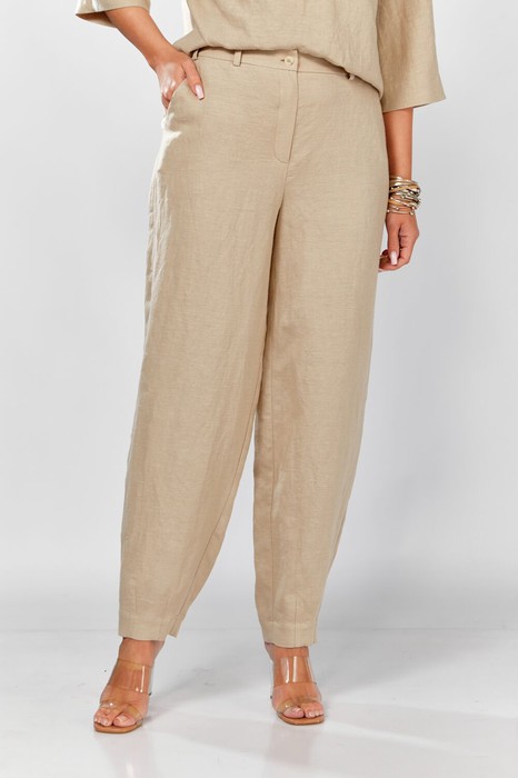 Брюки женские.Спереди застёжка на молнию и пуговицу.Сзади вытачки. В боковых швах карманы с отрезным бочком.Пояс по спинке на резинке , дополнен шлёвками.По низу брюк вытачки, создающие зауженный эффект.