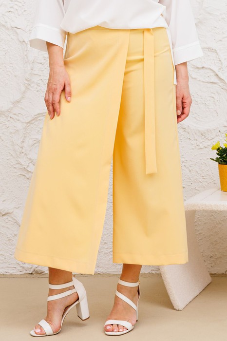 Модные брюки-кюлоты с элегантным запахом, свободной посадки, брючины широкие укороченные, чуть выше щиколотки. По переду молния, сзади по поясу вставлена резинка, запах фиксируется поясом на пряжке. С данными брюками можно смело создавать стильные комбинации с вещами Вашего гардероба. Длина брюк по боковому шву 92 см, шаговому — 62 см. Изделие подойдет на рост 170 см.