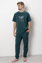 Брюки мужские из трикотажного полотна "лининг" свободного покроя, со смещенными к центрам передних половин боковыми швами, карманами в боковых швах и притачным поясом с эластичной тесьмой внутри. Нижние срезы обработаны подгибкой с эластичной тесьмой. Для регулирования степени прилегания изделия по талии предусмотрен шнурок, вставленный через две обметанные петли в центре пояса спереди.