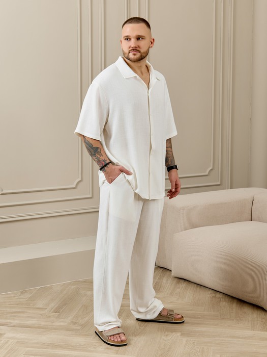 Брюки мужские из фактурного полотна на притачном поясе с эластичной тесьмой внутри, с карманами в боковых швах. Средний шов передней половины выполнен с имитацией застежки "гульфик". Для регулирования степени прилегания изделия в области талии предусмотрен шнурок из основной ткани, вставленный в пояс через две обметанные петли. Нижние срезы брюк обработагны подгибкой.