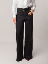 Брюки женские из трикотажного гладкокрашенного полотна «скуба», длинные, полуприлегающего силуэта, на притачном поясе с эластичной тесьмой внутри и карманами в боковых швах. Передние половины застрочены по центральным линиям, на задних половинах обработаны две вытачки в области талии.