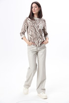 Брюки средней посадки, свободные вверху, слегка зауженные к низу с наклонными боковыми карманами. Низ брючины фигурный. Пояс широкий отрезной, сзади на эластичной тесьме-резинке, по переду застежка на петлю и пуговицу.