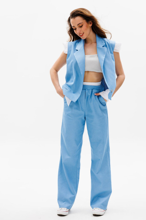 Широкие брюки с двойным поясом из отделочной контрастной хлопковой ткани. Изделие по линии талии на резинке с имитацией гульфика. Карманы с отрезным бочком.