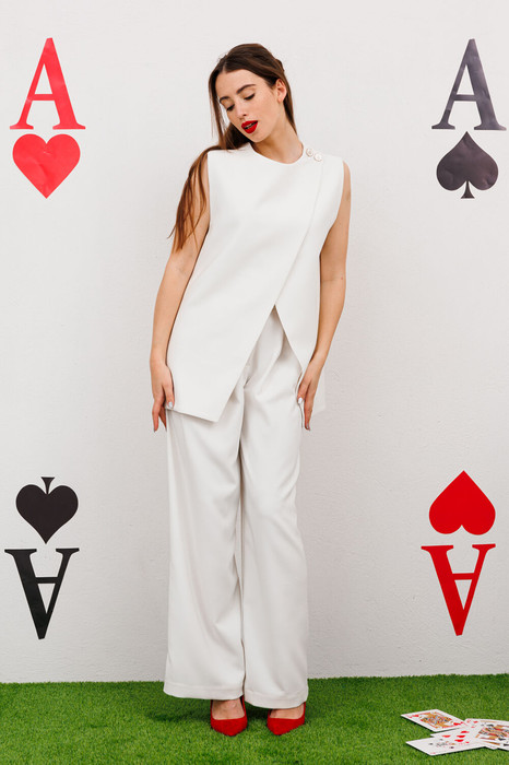 Элегантные брюки прямого кроя с боковыми карманами с отрезным бочком. Застежка на молнию и пуговицу. По переду - складки. Задние половинки с талиевыми вытачками и прорезными карманами с листочкой. Верхний срез обработан притачным поясом, по спинке на резинке.