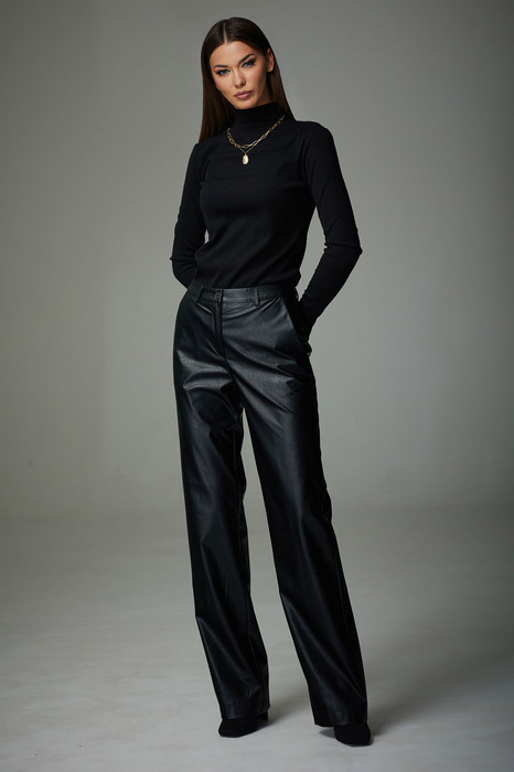Брюки прямого силуэта. Модель выполнена из экокожи. Верхний срез брюк обработан поясом, карманы наклонные к боковым швам. На передних половинках застежка с гульфиком на тесьму-молнию. В шов притачивания пояса вставлены шлевки. На задних  половинах расположены талиевые вытачки.
