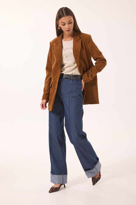 Брюки выполнены из джинсовой ткани, расширены к низу. На передней и задней половинках отстрочены стрелки до контрольных точек. На задней половинке – кокетка и накладные карманы. На передней половинке – боковой карман, с правой стороны – маленький накладной кармашек. Верхний срез обработан поясом со шлевками. Низ брюк с широкой манжетой на изнаночную сторону джинса.