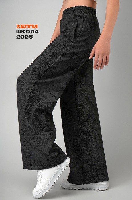 Чёрные брюки палаццо для девочки подростка с эффектом варёнка выглядят стильно и удобно в любой ситуации. Мягкий хлопковый трикотаж с потертой фактурой добавляет образу оригинальности.