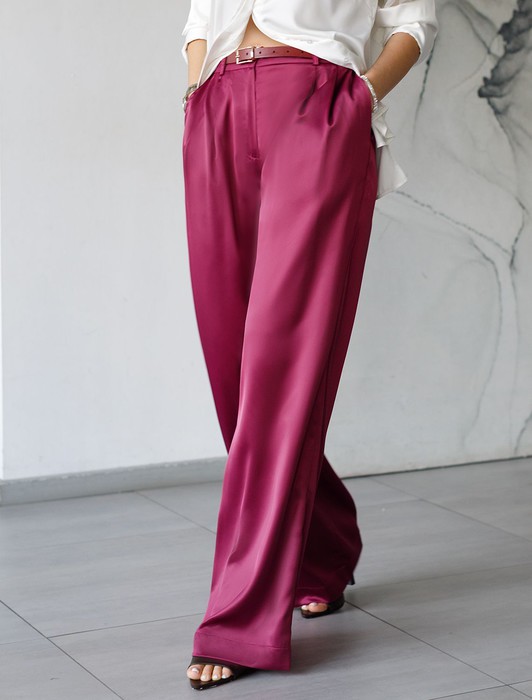 Состав: 97%ПЭ 3%ПУ Плотность: 190 Г/м2Брюки палаццо цвета бургунди из струящегося сатина, который придает образу эффектный и стильный вид. Мягкий сатин приятен к телу, в них комфортно на протяжении долгой носки. Брюки длиной в пол визуально вытягивают силуэт и подходят как для высоких, так и для женщин низкого роста. Модель идеально садится на большие размеры, не сковывая движений. Благородный материал обеспечивает не только привлекательный внешний вид, но и ощущение легкости в носке. Высокая посадка выгодно подчеркивает фигуру, добавляя изящества и современного шарма, они струятся при каждом движении.