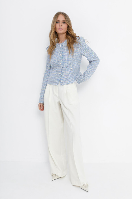 Детали: широкие брюки-палаццо с небольшими складками у пояса и заутюженными стрелками, притачной пояс со шлевками, застежка на молнию и пуговицу, боковые карманы. Задние части брюк с вытачками и имитацией карманов.