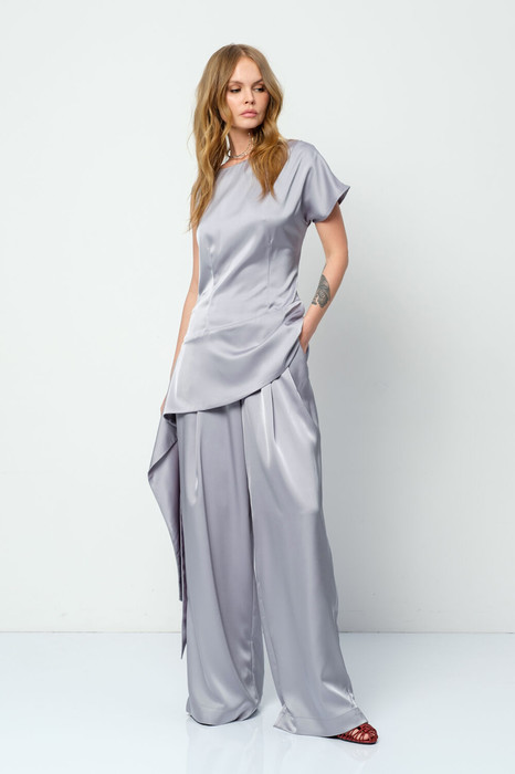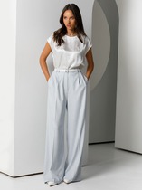 Детали: высокая посадка, передние половины брюк с двумя складками, эластичный пояс-резинка, боковые карманы, без застежки.