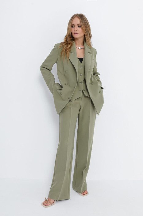 Детали: высокая посадка, притачной пояс со шлевками, передние половины с небольшими застроченными мягкими складками и заутюженными стрелками, застежка на молнию и пуговицу, боковые карманы. Задние части брюк с вытачками и заутюженными стрелками. Пояс брюк прямой, без резинки.