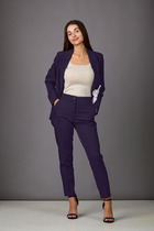 Детали: высокая посадка, прилегающий силуэт, притачной пояс со шлевками, застежка на молнию и пуговицу, перед с боковыми карманами, спинка с кокеткой и двумя накладными карманами.
