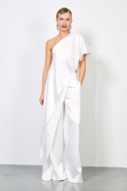 Модель зауженная к низу, со стрелками, на подкройном поясе. Пояс со шлёвками и хлястиком. Застёжка на молнию, крючки и пуговицу на поясе. Спереди карманы в подрезных. Сзади прорезной карман в рамку, застёгивающийся на пуговицу.