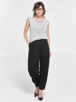 Модель прямого силуэта. Пояс притачной, с резиной и шлёвками. Застёжка на молнию и крючки с пуговицей на поясе. В боковых швах карманы и лампасы из декоративной тесьмы. Сзади прорезные карманы с листочкой. В шлёвки вставлен пояс-шнурок с наконечниками.