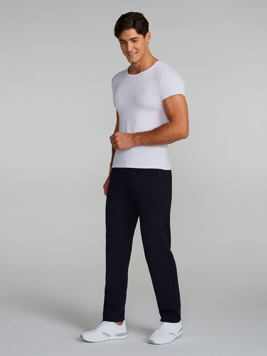 Брюки мужские из хлопкового трикотажного полотна. Карманы выполнены в боковых швах без молний. Пояс по талии регулируется шнурком.
