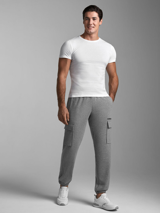 Брюки мужские из хлопкового трикотажного полотна в стиле "карго". Верхние карманы прорезные с листочками. Ниже по бокам брюк есть дополнительные объемные накладные карманы с клапанами. Низ брюк присобран на эластичную резину. Пояс по талии регулируется шнуром.