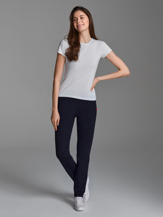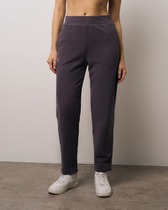 Брюки женские из плотного и мягкого хлопкового трикотажного полотна с изнаночным начесом. Карманы прорезные с листочками и молниями. Пояс брюк и манжеты из эластичного трикотажного полотна рибана. Пояс по линии талии регулируется шнуром.