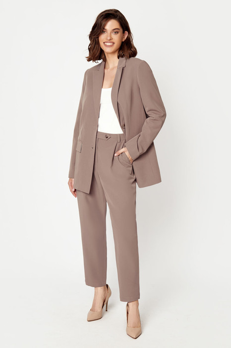 Брюки заужены к низу. Пояс со шлевками . На передних половинках функциональные карманы. По задним половинкам декоративные карманы с листочками. Центральная застежка на молнию и петлю-пуговицу .