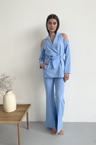 Брюки женские из трикотажной ткани (двунитка), слегка заужены к низу. По переду брюк расположены накладные карманы. На левом кармане  настрочной декоративный элемент. В пояс вставлена резинка по кругу.