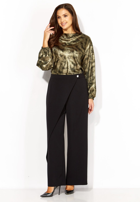 Брюки прямые, из текстильной ткани, с отлетной деталью по переду, закрепленной на отделочную кнопку. застежка брюк спереди на тесьму "молния" и петлю с пуговицей. Пояс отрезной, по переду гладкий, сзади на резинке.