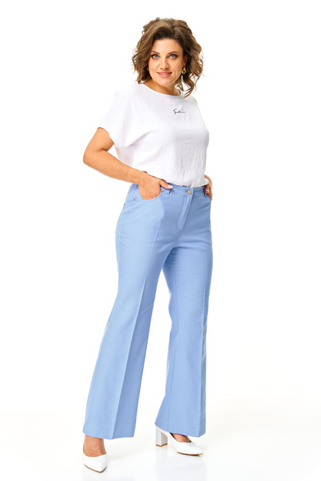 Брюки клёш от колена с центральной застёжкой на молнию и петлю-пуговицу. По передним и задним половинкам заутюжены канты. В боковых швах карманы. Задние половинки с отрезными кокетками и накладными карманами. Пояс притачной.