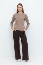 Брюки женские из трикотажного полотна "футер-двунитка", на притачном поясе с эластичной тесьмой внутри, с карманами в боковых швах и отделочными деталями фигурной формы на передних половинах. Нижние срезы брюк обработаны с эластичной тесьмой. По швам притачивания отделочных деталей, декоративных вставок и карманам настрочены отделочные строчки. На левой передней половине брюк ниже кармана настрочен декоративный элемент прямоугольной формы. Через две петли в центре пояса петли продет шнурок, позволяющий регулировать степень прилегания изделия по талии.