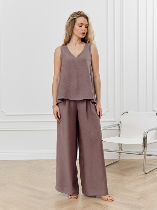 Брюки женские из гладкокрашеного фактурного полотна длинные, широкие по всей длине, на притачном поясе с эластичной тесьмой внутри, с карманами в боковых швах. Модным элементом является широкая подгибка нижних срезов.