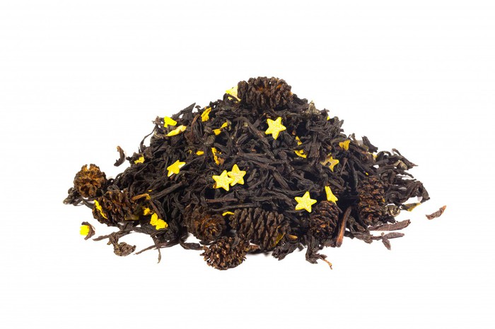 Краткое описание: Купаж черного и зеленого чая с добавлением шишек ольхи, разноцветной сахарной посыпки Звезды, лепестков подсолнечника и ароматом горького миндаля и груши. Сорт высший.