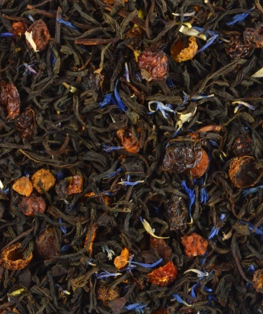 Купаж из классических черных индийских чаев с добавлением плодов шиповника, лепестков василька, вишни. Содержит пищевые ароматические масла.