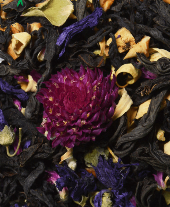 Купаж из классических черных индийских чаев с добавлением кусочков сушеного яблока, цветков апельсинового дерева, лепестков мальвы, бутонов гомфрены.. Содержит пищевые ароматические масла