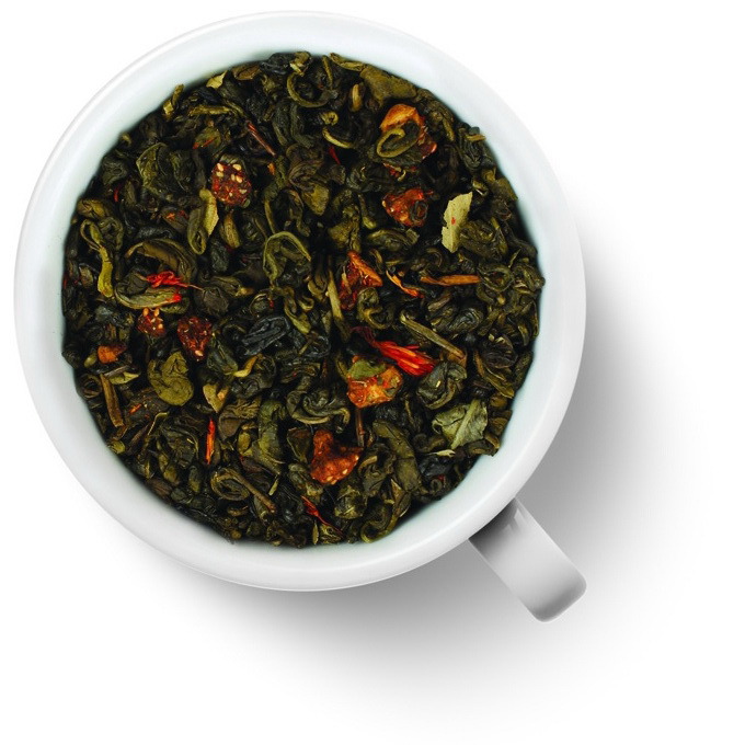 Краткое описание: Зеленый чай Ганпаудер с лепестками сафлора и кусочками клубники.